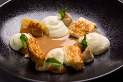 Krema pečenih jabolk s karamelo, skutina espuma, hrustljavo listnato testo, karamelina krema, cimetov čips